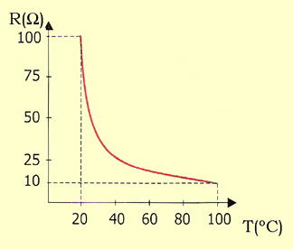 - Termistores NTC, de coeficiente de temperatura negativo, la resistencia disminuye al aumentar la temperatura y viceversa.