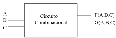 Un ejemplo de un circuito combinacional que tiene 3 entradas: A,B y C, y dos salidas F, G, que son dos funciones booleanas que dependen de las variables de entrada: F(A,B,C) y G(A,B,C), siendo por ejemplo, el valor de las funciones: