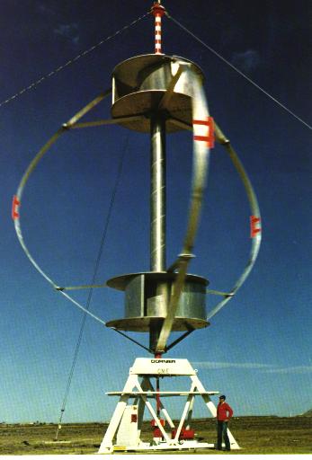 - Aerogenerador de eje vertical: El generador se localiza en la base de la torre y aunque es más sencillo de mantener, el rendimiento de la instalación es menor que en los aerogeneradores de eje horizontal por lo que prácticamente no se utilizan.