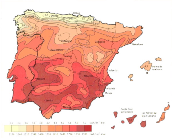 A partir del mapa de radiación solar (kWh/m2) captada en España (tomar el valor medio del intervaloindicado), se desea saber: