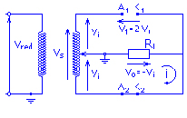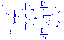 El circuito de la figura es un rectificador con dos diodos. Cada diodo se encuentra polarizado de modo distinto para cada semionda de la señal de alimentación, ya que las diferencias de potencial a las que están sometidos son de signo contrario; por tanto uno se encontrará polarizado inversamente y el otro directamente. La tensión de entrada (Vi) es la mitad de la tensión del secundario del transformador.