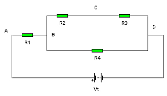 Si continuamos calculando la resistencia R1,2,3,4, que será la resistencia total resultante de la asociación en serie de R1 y R2,3,4, por lo que su valor será: