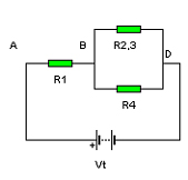 Observando los circuitos equivalentes que hemos producido, se comprueba que en realidad la caída de tensión en bornes de R2,3,4, es igual a la caída de tensión en bornes de R2,3 y de R4, ya que ambas están conectadas en paralelo: