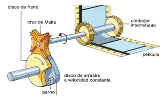 Este movimiento intermitente se consigue utilizando la rueda de Ginebra. (Los proyectores modernos suelen utilizar mecanismos controlados electrónicamente o un motor paso a paso).