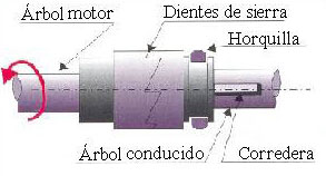 Está constituido por un plato con muescas en forma de dientes; en el extremo del árbol conducido se monta otro plato, con las mismas estrías, que puede deslizar longitudinalmente a lo largo de su eje. Solamente transmite movimiento en un sentido.