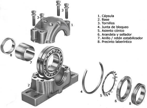 En esta primera imagen (pulsa sobre ella y la verás ampliada) tenemos la vista explosionada del montaje de un rodamiento esférico.