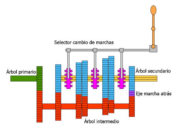 - Árbol intermedio, es el árbol transmisor, consta de una corona que engrana con el árbol primario, y de varios piñones unidos solidariamente al árbol, que pueden engranar con el árbol secundario en función de la marcha seleccionada.