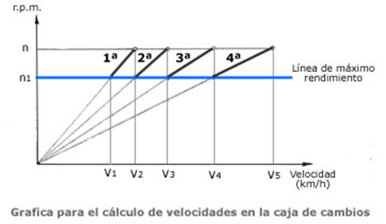 Siendo "n" el número de revoluciones máximas del motor y "n1" el numero de revoluciones al cual se obtiene el par de transmisión máximo del motor (par motor máximo), dentro de ese régimen deben establecerse las sucesivas desmultiplicaciones en la caja de cambios. Entre estos dos limites (n y n1) se obtiene el régimen máximo y mínimo en cada desmultiplicación para un funcionamiento del motor a pleno rendimiento.