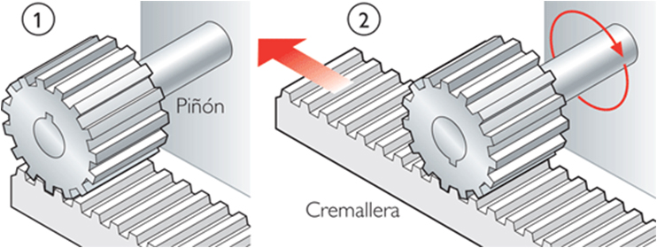 Este mecanismo transforma el movimiento giratorio de un eje, en el que va montado un piñón, en movimiento rectilíneo, al engranar los dientes del piñón con los dientes de una barra prismática (cremallera) que se desplaza longitudinalmente.