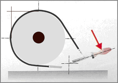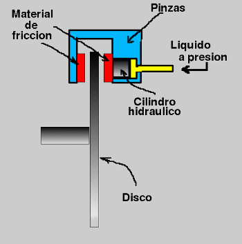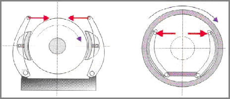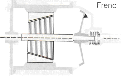La acción de frenada puede ser efectuada por desplazamiento axial del árbol contra el cubo de freno o por aproximación del freno a la polea montada sobre el árbol.