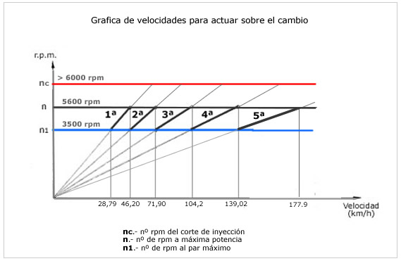 Siendo "n" el número de revoluciones máximas del motor y "n1" el numero de revoluciones al cual se obtiene el par de transmisión máximo del motor (par motor máximo), dentro de ese régimen deben establecerse las sucesivas desmultiplicaciones en la caja de cambios. Entre estos dos limites (n y n1) se obtiene el régimen máximo y mínimo en cada desmultiplicación para un funcionamiento del motor a pleno rendimiento.