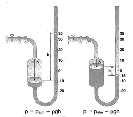 Se realiza la comparación de la presión con la presión ejercida por un líquido de densidad y altura conocidas. El caso más utilizado es el manómetro de tubo en U. Este sistema se utiliza para medir presiones cercanas a la atmosférica. Consta de un tubo en forma de U (en la actualidad se ha prohibido el uso de mercurio) con una de las ramas abiertas. Sobre la segunda rama se aplica la presión a medir. Como la presión es distinta en las dos ramas hay un desplazamiento del fluido, de forma que la presión p a medir es: