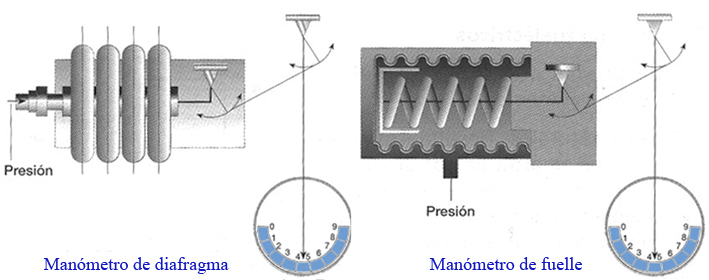 Tubo Bourdon: Tubo curvado constituyendo un anillo casi perfecto. Al aplicar presión al fluido contenido en su interior, el tubo tiende a enderezarse, transmitiendo este movimiento a una aguja que se desplaza sobre una escala graduada. Cuando se necesita una medida de presión más amplia y precisa el tubo de Bourdon se arrolla en forma de espiral y en hélice, lo que provoca un movimiento más amplio de la aguja sobre la escala graduada. Diafragma: Consiste en varios diafragmas circulares unidos entre sí por sus bordes, de modo que al soportar una presión, cada diafragma se deforma y la acumulación de todas estas deformaciones se amplifican a través de un sistema de palancas encadenadas, y son transmitidas a una aguja que se desplaza sobre una escala graduada. Fuelle: Es parecido al anterior, consta de un fuelle, que se dilata o comprime en función de la presión que soporta, trasladando esta deformación a una aguja.