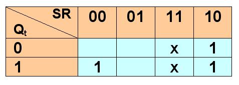 Vamos a aplicar el método al diseño de un flip-flop S-R. En nuestro caso la salida Q+ depende tanto de la salida anterior Q0, como de las entradas S y R, por lo que para implementarlo vamos a tratarlo como a un circuito combinacional, pero considerando que Q0 es también una entrada, por lo que manejaremos la tabla de verdad que se adjunta, a partir de la tabla de estado que acabamos de comentar.