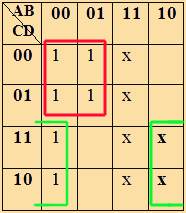 En ocasiones, en algunos problemas lógicos, hay combinaciones de las variables de entrada que no se pueden producir, o bien el valor que tome la función para esas combinaciones de las entradas es indiferente para la salida, en ese caso en la tabla de verdad en vez de poner en la salida un 1 o un 0, se pone una x y al simplificar por el método de Karnaugh se considera que el valor es un 1 o un 0 según lo que más favorezca para simplificar. Vamos a verlo con un ejemplo.