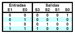 Deduciremos la tabla de verdad, utilizando un decodificador de 2:4, como comentamos anteriormente: