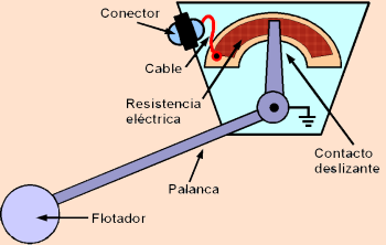 El otro extremo de la palanca del flotador tiene un contacto deslizante sobre una resistencia eléctrica que se mueve en sincronización con él, de manera que la posición del contacto sobre la resistencia también dependerá del nivel del líquido en el depósito.