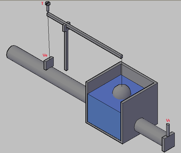 La válvula de control Ve consigue que el caudal de entrada de fluido en el depósito sea igual al flujo de salida, a base de mantener el nivel constante en el depósito. Regulando la posición del tornillo T, ajustamos el nivel deseado.
