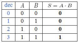 Esta función responde a la tabla de verdad que se acompaña, debe entenderse como: La salida correspondiente a la función lógica producto toma valor 1 solamente cuando también son 1 los valores de las entradas A y B.