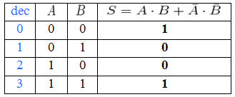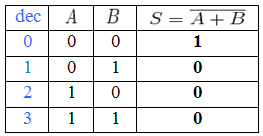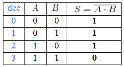 Esta función responde a la tabla de verdad que se acompaña, debe interpretarse como: La salida correspondiente a la función lógica toma siempre valor 1 salvo cuando A y B tienen a la vez valor 1.