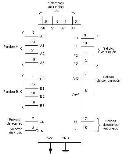 Como salidas tiene los 4 bits del resultado, más una salida comparador (A = B) y salidas de acarreo.
