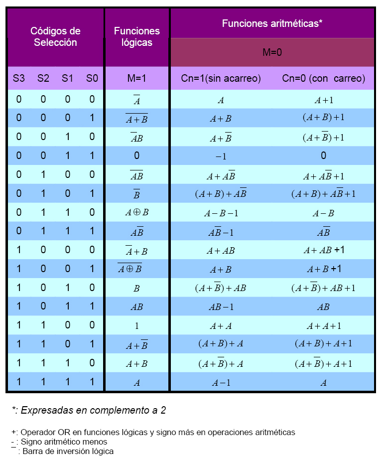 Tabla con las funciones que pueden realizarse con el 74LS181