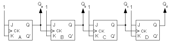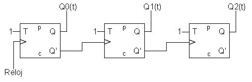 Se construyen a partir de biestables de tipo T. Cada biestable cambia cuando el anterior pasa de 1 a 0 y el primero lo hace con cada pulso que le llega.