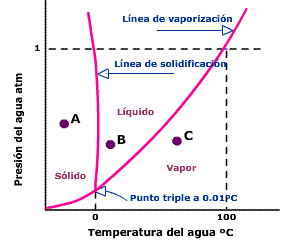 Cálculo de F, el número de grados de libertad con la regla de fases de Gibbs, en tres puntos distintos del diagrama de fases del agua pura: