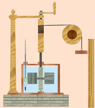 Joule trató de demostrar que era posible aumentar la temperatura del agua transfiriéndole energía mecánica. Para lo que construyó una máquina parecida a la representada en la figura. Dentro de un recipiente se introduce 1 kg de agua a 14,5ºC, en el interior se sitúa un eje solidario a unas aspas, conectadas a una masa, por medio de una cuerda, que tiende a caer por gravedad, al descender ésta a una velocidad constante, las aspas giran debido a la energía potencial de la masa. El giro de las aspas se convertía en calor, aumentando la temperatura del agua.