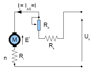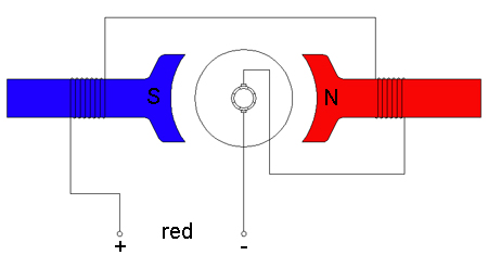 El esquema de un motor autoexcitación serie es como el de la figura, donde se observa que el devanado inductor está conectado en serie con el devanado del inducido, por lo que en este caso solamente hay un circuito eléctrico, la intensidad del inducido y la de excitación serie serán iguales, y de valor muy elevado, para que no ocasionen caídas de tensión elevadas en este devanado es preciso que tenga pocas espiras y además estas deben ser de hilo grueso.