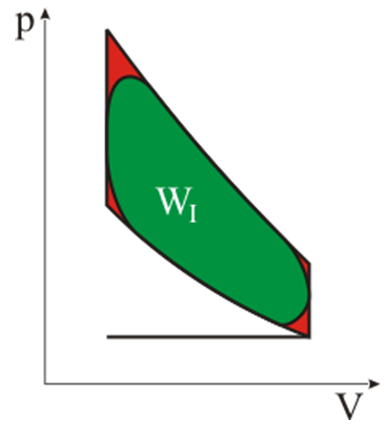 Esto provoca que el diagrama real difiera ligeramente del diagrama ideal, siendo el trabajo producido, llamado trabajo indicado (WI) algo inferior al teórico (WT).