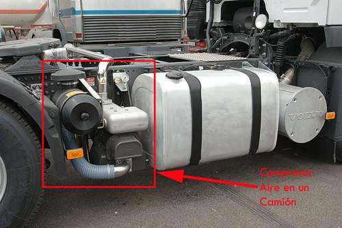 En la imagen siguiente, ves un chasis de un camión (de forma análoga se monta en un autobus) y recuadrado se ve cómo se instala un compresor en un vehículo de gran tonelaje.