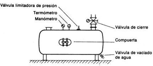 Debe cumplir varios requisitos; entre ellos: disponer de una puerta para inspección interior, un grifo de purga, un manómetro, válvula de seguridad, válvula de cierre, e indicador de temperatura.